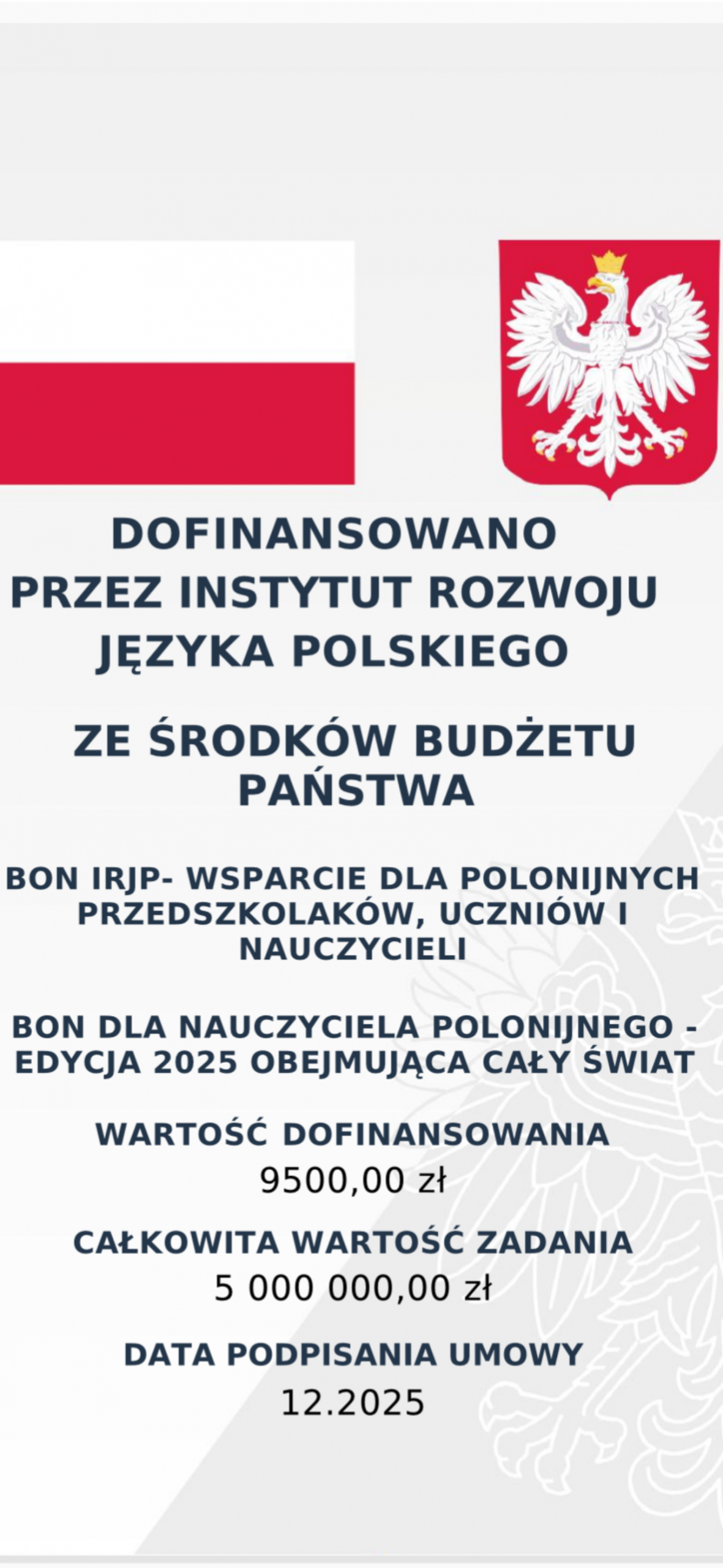 6 stycznia 2026 Dziekujemy za wsparcie finansowe naszych nauczycieli. Dofinansowano przez Instytut Rozwoju Języka Polskiego ze środków Budżetu Państwa. Bon IRJP dla nauczyciela polonijnego – edycja 2025 obejmuje cały świat.