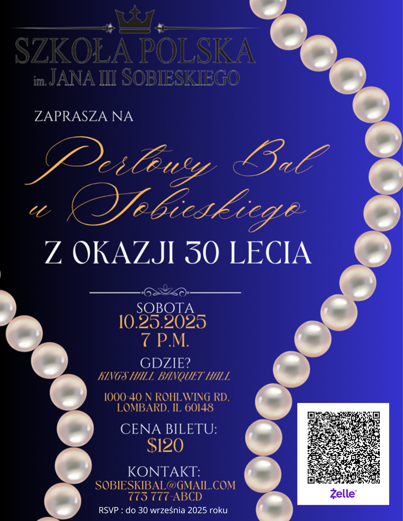 W sprawie pytań, rezerwacji i zakupu biletóww cenie $120 prosimy o kontakt:📧 sobieskibal2025@gmail.com📞 773-777-2223.